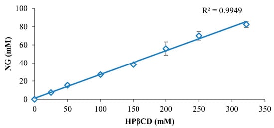 The observed stability constant (K1:1) in the Higuchi–Connors method could estimate the strength of the guest–CD interaction representing several guest solubilizing mechanisms that exist together in non-ideal aqueous cyclodextrin solutions [27]. The calculated K1:1 based on the Higuchi–Connors method (Equation (2)), indicated a high stability constant, up to 11 × 103 M−1, which showed the high affinity of NG for HPβCD.