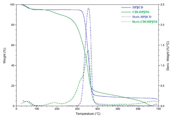 TGA and its corresponding derivative (DTG) curves were recorded to analyze and differentiate the CDI-HPβNS from HPβCD (as its monomer) through changes in their thermal degradation paths (Figure 3). HPβCD exhibited a two-step mass loss as expected [36]: the first step due to vaporization of adsorbed environmental water at temperatures up to 100 °C, which is a typical phenomenon for hygroscopic materials; the second step owing to decomposition of HPβCD starting at around 300 °C with the maximum mass-loss rate at about 350 °C.