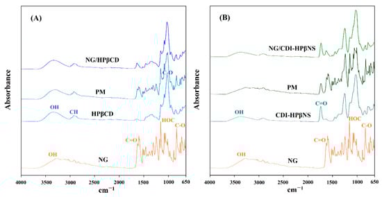 ATR-FTIR spectra of (A) NG, HPβCD, NG + HPβCD physical mixture (PM), and NG/HPβCD complex and (B) NG, CDI-HPβNS, NG + CDI-HPβNS physical mixture (PM), and NG/CDI-HPβNS.