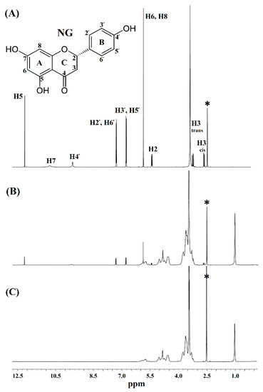 Proton nuclear magnetic resonance (1H NMR) spectra of (A) NG, (B) NG/HPβCD complex, and (C) HPβCD (* denotes DMSO-d6 peak at 2.5 ppm).
