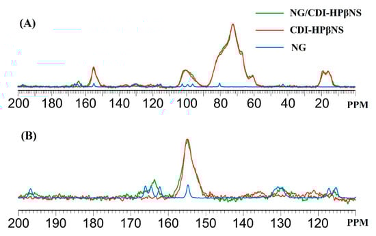 (A) Overlay of 13C CPMAS spectra of NG/CDI-HPβNS (in green), CDI-HPβNS (in red), and NG (in blue), in the 0–200 ppm range; (B) Detail in the 110–200 ppm range.