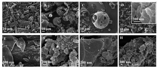 Scanning electron microphotographs of NG (A,E), HPβCD (B), NG + HPβCD physical mixture (C), NG/HPβCD complex (D), CDI-HPβNS (F), NG + CDI-HPβNS physical mixture (G) NG/CDI-HPβNS (H).