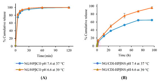 The release profile of NG/HPβCD (A) and NG/CDI-HPβNS (B) in two conditions: pH 7.4 at 37 °C and pH 6.6 at 39 °C.