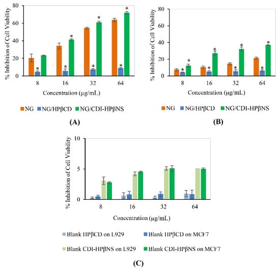 Cytotoxicity study of NG and NG-loaded carriers in L929 cells (A) and MCF7 cells (B), cytotoxicity study of blank carriers in L929 and MCF7 cells (C); * indicates significant difference (p < 0.05) between the NG/HPβCD or NG/CDI-HPβNS with NG via one-way ANOVA followed by Tukey post hoc test.