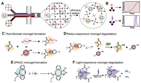 In this work, we examined the ability to form microgels responsive to endogenous and exogenous stimuli and laden with a biopolymer cargo using different spontaneous click chemistries and labile linkers within a microfluidic flow-focusing (MFF) device (Figure 1). First, microgels were formed through a thiol-Michael addition and, by altering the nature of the thiol moiety, could be made to either degrade in aqueous environments or degrade in response to glutathione (GSH, a peptide with increased concentrations in tumors) through the retro-Michael addition in combination with aqueous environments. The degradation behavior of the formed redox-responsive microgels in the presence of different buffer conditions was evaluated toward creating sustained release of large hydrophilic therapeutic proteins. Next, to establish the utility of the microfluidic device design to form microgels using different polymerization and degradation chemistries, light-responsive microgels were formed using a strain-promoted azide-alkyne cycloaddition (SPAAC). Light responsiveness was achieved through the incorporation of a nitrobenzyl (NB) cleavable moiety into the hydrogel backbone. Finally, the light-based degradation of NB-containing microgels was examined toward creating on-demand rapid release of biopolymer cargo. Together, these new microgel chemistry formulations can be utilized to control the release of hydrophilic therapeutics over multiple time scales and allow various levels of user control (days to weeks in response to endogenous stimuli or immediately with externally applied stimulus), providing a path toward improved therapeutic treatment regimens.