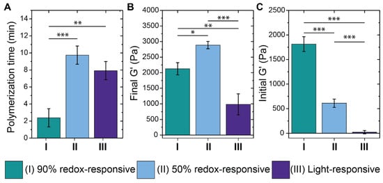 Mechanical properties of hydrogel formulations. The polymerization time (A), the final in situ storage modulus (B), and the initial in situ storage modulus value recorded by the rheometer (C) were examined for each hydrogel formulation. The final formulations investigated were (I) 90% and (II) 50% redox-sensitive crosslinked and (III) NB light-responsive SPAAC crosslinked hydrogels. Shown is the average and standard error for n = 3 samples, where * indicates p < 0.05; ** indicates p < 0.01; *** indicates p < 0.001.