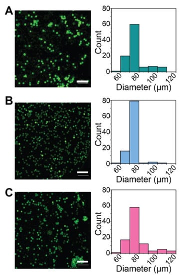 MFF of immiscible fluids provides a route to form homogeneous microgel populations, which have been utilized for applications ranging from drug delivery to cell encapsulation and tissue engineering [,,]. When utilized for spontaneous click chemistries, it is important to maintain component separation until immediately before the droplet is formed to prevent clogging of the device due to premature hydrogel formation. To this end, three aqueous inlet channels were merged just prior to the combined stream being pinched off by a fluorinated oil stream to form a droplet (Figure 1A). Additionally, we found, through early experiments, that the viscosity and polymer concentration of the macromer containing streams needed to be similar for consistent microgel formation to be achieved. Within this device, the 5 wt% thiol end-functionalized four-arm PEG (different ratios of PEG-4-alkyl-SH:aryl-SH) and 5 wt% maleimide end-functionalized four-arm PEG (PEG-4-MI) were introduced through the outside channels and buffered by a PBS stream containing a model protein cargo (bovine serum albumin (BSA)-488), which is similar in size to many bioactive growth factors and cytokines and allows easy visualization of the resulting microgels and protein release []. Microgels containing 90%, 50%, and 0% redox-degradable content were successfully formed and observed to have similar diameters, showing that alterations to the degradable content and differences in the crosslinking kinetics observed for 90% and 50% aryl-thiol conditions did not alter microgel formation properties (Figure 3). In addition, all formulations had low coefficients of variation (CV90% = 15%; CV50% = 8%; CV0% = 13%), indicating homogenous microgels especially when compared to batch emulsion or extrusion fragmentation techniques that typically result in higher levels of dispersity (e.g., CV ~30–40% for batch emulsions []; preliminary findings with inverse suspension polymerization resulted in CV ~70% (Figure S16)). The dispersity of particles formed here was within the range of that observed for other PEG-based microgels formed using microfluidic flow-focusing methods (CV = 5–20%) [,].