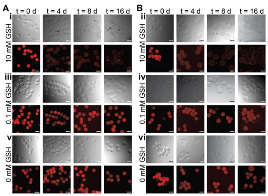 Degradation of microgels containing redox-sensitive crosslinks. Microgels containing 50% (A) or 90% (B) redox-sensitive crosslinks and 5 mg/mL 70 kDa dextran-TRITC were incubated in either 10 mM GSH (i,ii), 0.1 mM GSH (iii,iv), or PBS pH = 7.4 (v,vi). Representative brightfield (top) and fluorescent (bottom) images of the microgels at 0, 4, 8, and 16 days are shown. Scale bars = 50 µm.