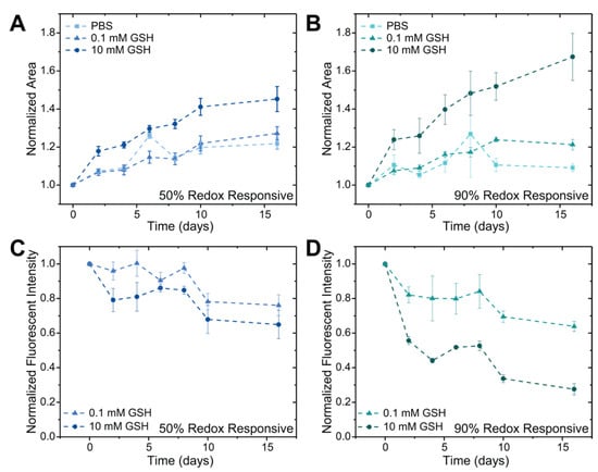 In addition to observing the change in the microgel area over time, the release of dextran was monitored over the experimental timeframe by determining the average fluorescent intensity within the microgels. The fluorescent intensity measured at each time point was first normalized to the average intensity of control PBS microgels at that time point, to account for any possible photobleaching caused by imaging, followed by normalization to the fluorescent intensity of that condition at t = 0, to account for any possible variations in dextran loading. Within the 50% redox-degradable formulation, decreases in the average fluorescent intensity were observed to be similar for formulations incubated in both 0.1 and 10 mM GSH, likely due to the rate of degradation of the hydrogel network being on the same time scale as hindered diffusion of the dextran out of the hydrogel network (Figure 5C). In comparison, differences in the release profile of the 90% redox-degradable microgels incubated in 10 mM GSH versus 0.1 mM GSH were observed (Figure 5D). The rate of degradation of microgels containing 90% redox-sensitive crosslinks in high GSH concentrations was observed to be greater than that of hindered diffusion of the dextran out of the network. Indeed, as the fluorescent intensity for microgels in 10 mM GSH is normalized to that of microgel incubated in 0 mM GSH (control), a flat straight line would be observed for fluorescence intensity if there was no difference in release for the 10 mM condition compared to the 0 mM condition. Consequently, the observed decreases in normalized fluorescence intensity for the microgels in the 10 mM condition supports the importance of microgel degradation in cargo release relative to 0 mM condition, where hindered diffusion of the dextran out of the network would dominate the release mechanism. Further, increased release rates relative to 0 mM control were observed for both microgels containing 50% redox-sensitive crosslinks and those containing 90% redox-sensitive crosslinks incubated in less reductive environments. These results indicate that the increase in microgel size over time, which is known to correlate with the responsive degradation of crosslinks within the polymer network that comprises the microgel, leads to an increase in the mesh size of the hydrogel network and thus enhanced release compared to those with less increases in area []. Note, while the modulus of the 50% formulation was higher than the 90% formulation based on in situ rheometric measurements of the bulk hydrogels, no significant differences were observed in the rate of dextran release between these formulations at either no or low GSH concentrations; this observation indicates similar rates of release by hindered diffusion for the base formulations and further supports the importance of linker cleavage for the increased rates of release observed from the 90% formulation in high GSH concentrations. Overall, within microgels populations, both the percentage of degradable content and the amount of GSH in the microenvironment can be utilized to control the release of biopolymers.