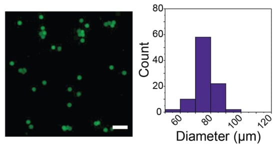 Formation of light-degradable microgels using SPAAC. Homogeneous photodegradable microgels were formed between PEG-4-DBCO and PEG-4-NB-azide and loaded with BSA-AF488 using MFF. Average microgel diameter formed using SPAAC with light-responsive crosslinks was 76.7 ± 6.2 µm. Scale bar = 200 µm. Representative images are shown on the left with histograms showing the distribution of diameters on the right.
