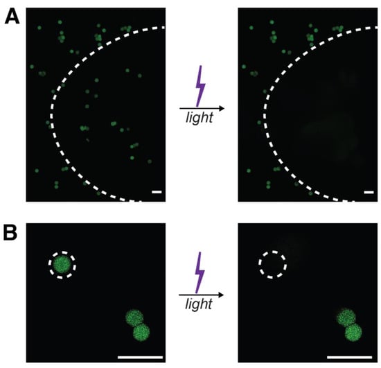 After SPAAC microgel formation and post processing, light-responsive microgels were resuspended in PBS and swollen overnight prior to being exposed to focused light supplied through the DAPI filter (excitation output ~300–400 nm) of the epifluorescent light source on a confocal LSM. The degradation of the microgels was observed to be rapid under the conditions investigated, highlighting their potential value in being used for burst protein release. Degradation of all microgels within a field of view, irradiated through 20× objective and imaged through a 10× objective, occurred with 30 s of flood irradiation with UV light (I0 = 1.5 mW cm−2) (Figure 7A), a cytocompatible dose of relevance for degradation of microgels through skin []. Next, targeted degradation of the light-responsive hydrogels was achieved by focusing the light on a single microgel, irradiated for 10 s (I0 = 1.5 mW cm−2) through the 40× objective with a partly closed aperture and imaged through a 20× objective (Figure 7B). The rapid degradation of the microgels, under 10 s, can be attributed in part to the short path length (~80 µm) the light must travel, making the microgels optically thin so that bulk degradation and complete erosion of the microgels are achieved for triggered burst protein release, in addition to the known cleavage kinetics for this photolabile moiety and low polymer weight percent used in microgel formation []. The half-life of 120 µm NB hydrogel films degraded on the rheometer with 365 nm alone has been found to be ~3 min, which is similar to the time of irradiation here, supporting rapid degradation of the microgels under this light dosage []. Additionally, the nitrobenzyl moiety utilized here has been shown to absorb light strongly within the 300–400 nm range, indicating that degradation would be faster here than observed when degraded with 365 nm light alone for a PEG-based microgel of a similar formulation [].