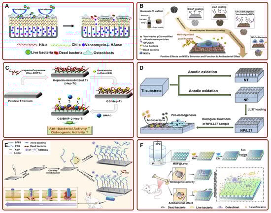 (A) Ti-based implants with multilayer, functional films inhibited bacterial adhesion and promoted osteoblast adhesion. Adapted with permission from Ref. []. Copyright 2018, Royal society of chemistry; (B) the preparation process diagram of Van-pBNPs/pep@pSiCaP-Ti scaffold for accelerating the osteogenic differentiation of BMSCs and inhibiting bacterial adhesion. Adapted with permission from Ref. []. Copyright 2020, Elsevier; (C) schematic illustration of the fabrication process of GS/BMP-2-Hep-Ti for enhancing antibacterial and osteogenic activity. Adapted with permission from Ref. []. Copyright 2012, Elsevier; (D) LL37-loaded NPs on Ti substrates could significantly improve the antibacterial and osteogenic activity. Adapted with permission from Ref. []. Copyright 2019, Dove medical press limited; (E) the schematic of the preparation process of FP-engineered Ti. The system could mitigate the activity of most bacteria and promote osseointegration. Adapted with permission from Ref. []. Copyright 2021, Elsevier; (F) schematic of ZIF-8@Levo-coated Ti-based implant fabrication and its antibacterial pathways. Adapted with permission from Ref. []. Copyright 2020, Elsevier. Abbreviations: HA-c: hyaluronate-catechol; Chi-c: chitosan–catechol; HAase: hyaluronidase; Ti: titanium; Van: vancomycin; pDA: polydopamine; MSCs: mesenchymal stem cell; SiCaP: Si-doped calcium phosphate; pBNPs: polydopamine-modified biodegradable bovine serum albumin-based nanoparticles; NT: nanotubes; NP: nanopores; PEG: polyethylene glycol; EPD: electrophoresis deposition; MOF: metal–organic framework; Levo: levofloxacin; Gel: gelatin; LBL: layer-by-layer self-assembly.