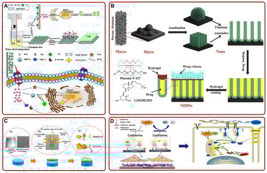 Moreover, some growth factors (e.g., transforming growth factor-β1 [], platelet-derived growth factor-BB []), hormones (e.g., parathyroid hormone [], insulin []) could be loaded and released by Ti-based implants to accelerate bone formation and improve osseointegration.