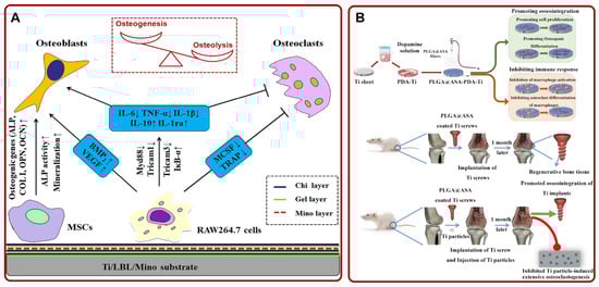 As a foreign body, implants may cause an inappropriate or excessive immune response, leading to cell or tissue damage and a series of inflammatory reactions, thus resulting in poor bone–implant integration []. Previous studies confirmed that macrophages played an important role in regulating inflammation. Specifically, the polarization of macrophages from the M1 pro-inflammatory phenotype to the M2 anti-inflammatory phenotype could inhibit inflammation []. Based on this property, Shen et al. confirmed that Ti/LBL/Mino enhanced the osteogenic differentiation of mesenchymal stem cells by promoting the conversion of macrophages to anti-inflammatory phenotype (Figure 5A) []. In addition, the wear particles produced after the implantation of the implant were also found to cause inflammation [,]. Ren et al. solved the inflammation caused by wear particles around the implant by smearing erythromycin on Ti []. Moreover, Wei et al. fabricated poly (lactic-co-glycolic acid) (PLGA)@aspirin (ASA) nanofiber coatings on polydopamine (PDA) modified Ti via electrospinning. Studies showed that the material inhibited osteolysis caused by abrasive particles. The material also improved osseointegration and suppressed immune response (Figure 5B) []. On the other hand, the inadequate antioxidant capacity of cells could trigger inflammation due to the generation of excess reactive oxygen species. Inflammation may further induce poor bone–implant integration. Thus, Lee et al. loaded antioxidant N-acetyl cysteine [] on the TNTs. The NAC-loaded TNTs could achieve local release and mitigate inflammation induced by reactive oxygen species [,]. In addition, indomethacin-loaded polymer-modified Ti [], ibuprofen-loaded TNTs [], and quercetin/CS/Ti-6Al-7Nb [] showed excellent effects of anti-inflammation and facilitating osseointegration.