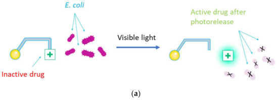 - Weinstain, R.; Slanina, T.; Kand, D.; Klán, P. Visible-to-NIR-Light Activated Release: From Small Molecules to Nanomaterials. Chem. Rev. 2020, 120, 13135–13272. [Google Scholar] [CrossRef] [PubMed]