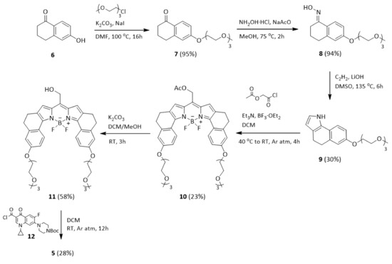 - Jang, Y.; Kim, T.-I.; Kim, H.; Choi, Y.; Kim, Y. Photoactivatable BODIPY Platform: Light-Triggered Anticancer Drug Release and Fluorescence Monitoring. ACS Appl. Bio. Mater. 2019, 2, 2567–2572. [Google Scholar] [CrossRef] [PubMed]