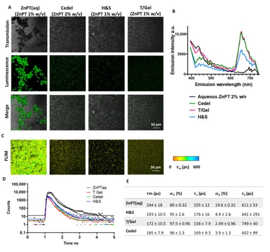 Spectral and lifetime characterisation of ZnPT particles in formulation. (A) Transmission, luminescence (at 800 nm excitation, emission 395–420 nm) and merge-mode images obtained using 40× objective. (B) Spectral emission scan at 800 nm excitation of formulations. (C) FLIM images (405/20 nm emission) with (D) corresponding decay curves and (E) lifetime parameters. m, average time-weighted lifetime; , relative-amplitude component of fast-decay component; 1, fast-decay lifetime; , relative-amplitude component of slow-decay component; 2, slow-decay lifetime.
