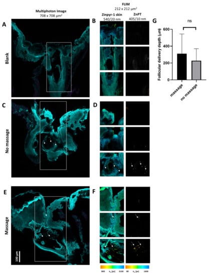 Follicular delivery of ZnPT from the positive and negative controls. (A) MPM image of a blank negative control with (B) the corresponding FLIM images along the length of the follicle. (C) MPM image of the no-massage positive control dosed with aqueous ZnPT 2% w/v and (D) the corresponding FLIM images along the length of the follicle. (E) MPM image of the 2 min massage positive control dosed with aqueous ZnPT 2% w/v and (F) the corresponding FLIM images along the follicle. For MPM images (A,C,E), two excitation wavelengths were used: two-photon excitation at 800 nm with emission collected at 395–420 nm (pink) and one-photon excitation at 488 nm with emission collected at 520–560 nm (blue). Scale bar = 100 μm. The parameters for the FLIM images (B,D,F): two-photon excitation at 740 nm with emission collected using a 405/10 nm bandpass filter for ZnPT and 540/20 nm bandpass filter for Zinpyr-1. FLIM images are pseudo coloured to the average time-weighted lifetime [ps]. (G) Student’s t-test for follicular delivery depth for massage and no-massage application. Arrows indicate position of deposited ZnPT particles.