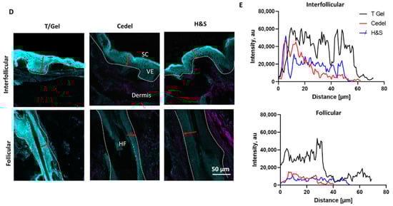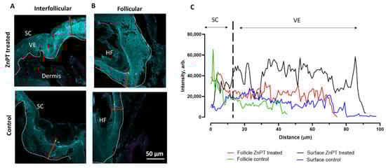 The Zinpyr-1 was used to map the labile zinc ion levels in the skin following the ZnPT application. The intensity levels of this probe were determined across the profiles of the skin on both the skin surface (interfollicular) and within the follicles for the ZnPT applied with massage (Figure 5A,B). In this way, it was possible to indirectly assess where the ZnPT had dissolved. The Zinpyr-1 intensity levels were similar in the follicular skin treated with ZnPT (aq) and the control; however, they were elevated in the viable epidermis of the ZnPT-treated skin (Figure 5C). The greatest intensity was observed for the viable epidermis from the interfollicular skin treated with ZnPT (aq). Meanwhile, for the commercial formulations, the interfollicular skin also had the greatest Zinpyr-1 signal compared to the follicles (Figure 5D). The T/Gel showed the greatest signal compared to the Cedel and H&S (Figure 5E) in both the follicle and interfollicular skin.