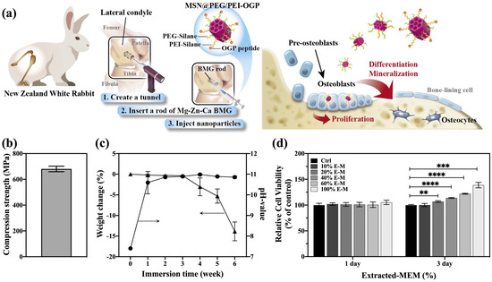 (a) Schematic illustration of Mg−Zn−Ca bulk metallic glass combined with mesoporous silica nanoparticle@PEG/PEI-osteogenic growth peptide for promoting bone regeneration in the tunnel. (b) Compressive strength measurement of Mg66Zn29Ca5 BMG. (c) Time−dependent degradation behavior of Mg66Zn29Ca5 BMG immersed in Hank’s solution. (d) Cell viability of MC3T3−E1 treated with different concentrations of extracted−αMEM. (n = 3 per group; data are the mean ± standard deviation, ** p < 0.01, *** p < 0.001, **** p < 0.0001). The circle represents the pH-value (right y-axis), and the triangle refers to the weight change (left y-axis) determined at each corresponding immersion time (x-axis).