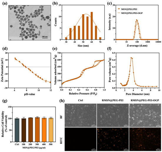 (a) TEM image and (b) particle size distributions of MSN@PEG/PEI. (c) DLS analyses of MSN@PEG/PEI and MSN@PEG/PEI−OGP in PBS. (d) Zeta potential measurements of MSN@PEG/PEI over pH ranging from 6 to 12. (e) Nitrogen adsorption-desorption isotherms and (f) pore size distribution of MSN@PEG/PEI. (g) Cell viability of MC3T3−E1 treated with different concentrations of MSN@PEG/PEI. (h) Fluorescence images of MC3T3−E1 cells at 24 h post−treatment.