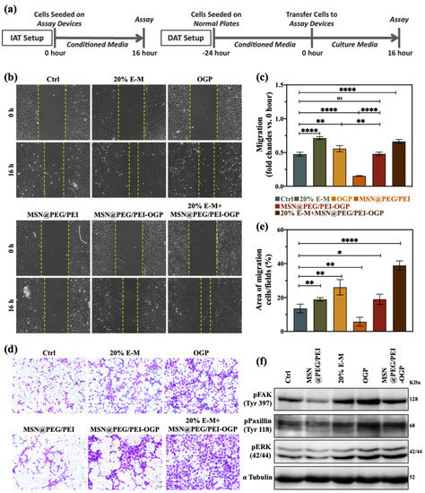 (a) Experimental design for cell migration/invasion study. (b) Scratch migration (wound healing) assay and (c) quantitative evaluation of MC3T3−E1 cells conducted immediately after treatment (IAT) of the conditioned media. (d) Transwell invasion assay and (e) quantitative evaluation of MC3T3−E1 cells conducted delayed after treatment (DAT) after treatment of the conditioned media. (f) Western blotting of phosphorylated (p)−focal adhesion kinase (FAK) (Tyr397), p−paxillin (Tyr118), p−extracellular signal−regulated kinase (ERK) (42/44), and α−tubulin expressions in MC3T3−E1 cells at 24 h post−treatment. The amount of nanoparticles was 100 μg/mL, and that of OGP was 6.06 μg/mL. (n = 3 per group). (Data are the mean ± standard deviation, * p < 0.05, ** p < 0.01, **** p < 0.0001).