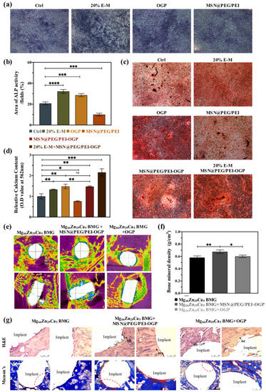 Previous studies have demonstrated that degraded magnesium alloys can increase bone mineral density (BMD) [6,7,55]; OGP can promote ALP activity and facilitate mineralization during osteogenesis in bone remolding [17,56]. Here, micro-CT scanning was applied to investigate BMD around the implantation site, and imaging reconstruction processes were conducted after treatment for 4 weeks. In Figure 4e, the bright white color represents the high-density regions of the Mg66Zn29Ca5 BMG implant, and the blue mark indicates newly formed bone. At 4 weeks post-surgery, little degradation of the implant was observed in all groups, while new bone formation attached around the implants was notable in MSN@PEG/PEI-OGP group. As shown in Figure 4f, the quantitative analysis confirmed that the combination of Mg66Zn29Ca5 BMG with MSN@PEG/PEI-OGP displayed the highest BMD value. Moreover, there is no difference between groups with and without the introduction of free OGP in BMD around the implantation site. The limited in vivo effect of OGP may be attributable to its nature of being quickly metabolized and short lasting in target areas. On the other side, benefiting from the properties of protecting drugs and being engulfed promptly by cells, MSN@PEG/PEI-OGP is suitable for durable and intracellular delivery of OGP.