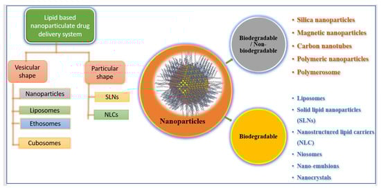 Advances in technology over the last two decades have resulted in the creation of nanoscale materials, which have resulted in a decrease in particle size and overall increases in surface area. Nanoparticles are particles with a size ranging from 1 nm to 1000 nm. The term “nano” is easily defined, but it encompasses a wide range of applications (Figure 1), including multiple nano-based systems made up of various types of materials used as nanocarriers (Figure 2) [,].