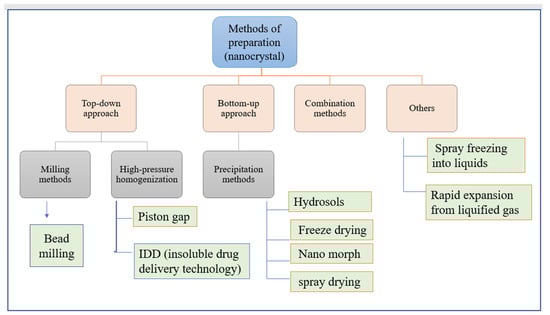 These are pure solid drug particle with sizes up to 1000 nm, primarily composed of 100% drug substance that is stabilized by stabilizer(s) or surfactant(s). Water, liquid polyethylene glycol (600), oil, or any “aqueous or non-aqueous” media has been used as a dispersing medium [,]. The noteworthy characteristics of nanocrystals enabled them to overwhelm difficulties such as increased “dissolution velocity, saturation solubility, and thickness to surface and cell membranes”. For the production of nanocrystals, two methodologies have been developed: a top-down approach and a bottom-up one. The top-down approach has defined approaches such as precipitation, high gravity-controlled precipitation technology, sono-crystallization, restricted impinging liquid jet precipitation technique, and multi-inlet vortex mixing techniques (Figure 5) []. In this process, the use of organic solvent, and its removal at the end, makes it moderately expensive. However, the bottom-up approach includes the application of high-pressure homogenization in grinding procedures []. Amongst all the methods, milling, precipitation, and high-pressure homogenization have been used most commonly for production. In nanocrystals, the mechanism followed by the drug for absorption includes solubility enhancement, suspension rate, and intestinal wall holding capacity []. These are associated with enormous advantages like enhanced solubility, disintegration, dissolution, bioavailability, and safer dosage form, and provide a higher level of safety because of their molecular size and surface properties []. Ni et al. developed a method by implanting “cinaciguat nano-crystals” into chitosan-based micro-particles, applied for hydrophobic drug delivery to the lungs. The polymer’s abilities of swelling and mucoadhesion enabled the continuous release of the drug, resulting in enhanced inhalation efficacy under diseased conditions []. More examples have been given in Table 3.