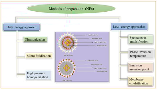 Nano-emulsions (NE) are non-homogeneous, transparent colloidal dispersion systems of 100 nm size that are optically isotropic and thermodynamically stable. These are comprised of water and oil followed by the addition of co-surfactant and surfactant []. The lipophilic drug has been entrapped into the oil droplets, both in o/w and w/o suspensions. These oil droplets were engulfed by the macrophages and found in higher amounts in the liver, spleen, and kidneys. However, hydrophilic drugs were in the aqueous phase of w/o or w/o/w nano-emulsions. Figure 6 demonstrated different methods of NE preparation and the structure of nano-emulsions. Owing to their higher internal membrane permeability, these condensed to the lymphatic system, administered through intramuscular and subcutaneous routes []. The absorption of NE through the intestine has been attributed to lymphatic transport processes, resulting in amended oral bioavailability of the entrapped drugs []. The main characteristics of NE involve the stability of entrapped components, targeted sustained release, enhancing membrane permeability through the skin and mucous membranes, solubilizing components of different lipophilicities, improving drug absorption, lessening pain and allergy conditions, lowering viscosities, simple methods of production, and fewer chances of contamination [,]. The attractive properties of NE enabled their use as a vehicle for the distribution of essential oils, nucleic acid, drugs antimicrobial agents, repellents, and as an imaging agent [,]. In the past few eras, nano-emulsions have been amended for transdermal remedial use like phospholipids, Transcutol®P, fatty alcohol, alkyl poly-glycosides, and PEGylated fatty acid ester []. Numerous nano-emulsion formulations incorporating herbal drugs like camptothecin, genistein, rutin, oils of Brucea javanica, resveratrol, coixenolide, etc., with plenty of health benefits have been listed in the literature [,]. With great application scenarios of NE, more examples have been presented in Table 4.