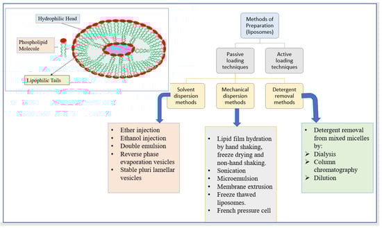 Alec Bangham developed liposomes in 1960. These polar lipid nanoparticles are spherical in form and range in size from 50 to 450 nanometers. These can encase an “aqueous core” in “single or multiple lipid bilayers of natural or synthetic origin” into which it freely diffuses []. They have a membrane structure that is similar to that of cells. Liposomes are composed of materials that have both lipophilic and hydrophilic groups, allowing them to encapsulate both types of pharmacological molecules in the same structure []. Liposomes can increase drug solubility, drug delivery, the bioavailability of the entrapped drug, absorption of the drug within a cell, and drug distribution throughout the body both in vivo and in vitro due to their unique property of possessing phospholipid bilayers [,]. Figure 7 depicts the structure of liposomes as well as several liposome manufacturing methods.