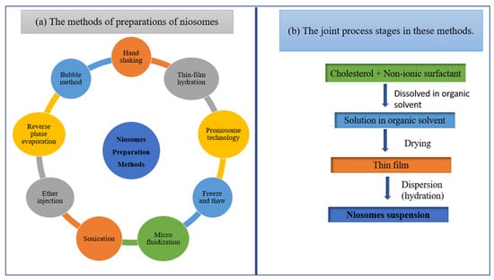 Schematic diagram of (a) the methods of preparations of niosomes and (b) the joint process stages in these methods.