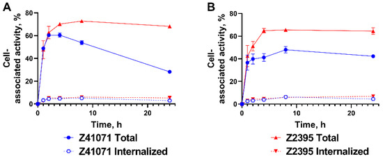 Binding and cellular processing of 188Re-ZHER2:41071 and 188Re-ZHER2:2395 by HER2-expressing SKOV-3 (A) and SKBR-3 (B) cells. Data are presented as an average (n = 3) value ± SD.
