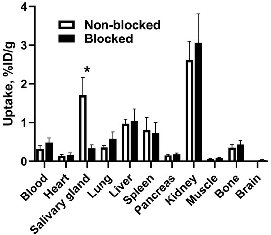 Effect of blocking of Na/I-symporter on biodistribution of 188Re-ZHER2:41071 in NMRI mice at 4 h p.i. The tissue uptake values were calculated as the percentage of injected dose per gram (%ID/g). Data are presented as an average (n = 4) value ± SD. Asterisk (*) indicate significant differences (p < 0.05) between blocked and non-blocked groups.