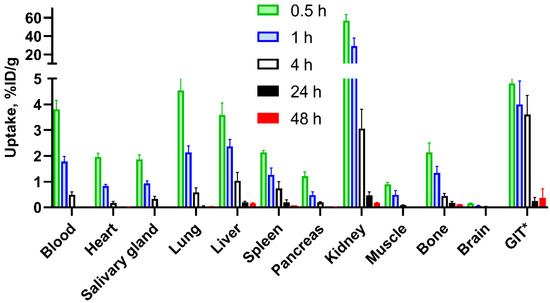 Biodistribution of 188Re-ZHER2:41071 in NMRI mice at 0.5, 1, 4, 24, and 48 h after injection. *GIT = gastrointestinal tract. Data are presented as %ID per whole sample. Data are presented as an average (n = 4) value ± SD.