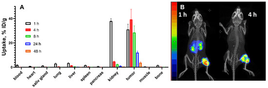 The data concerning the biodistribution of 188Re-ZHER2:41071 in BALB/C nu/nu mice bearing HER2-expressing SKOV-3 xenografts are presented in Figure 6 and Figure 7 and Table S2. In agreement with the biodistribution data in normal NMRI mice, 188Re-ZHER2:41071 cleared rapidly from blood and normal tissues including kidneys. The uptake in tumor was high, 31 ± 4%ID/g already 1 h after injection (Figure 6A and Table S2). By this time point, the tumor uptake was higher than the uptake in majority of organs and similar with the uptake in kidney. However, the tumor uptake remained to be high over time while the activity in kidneys declined rapidly. Already 4 h after injection, the tumor uptake was more than 8-fold higher than the renal uptake. This created a favorable precondition for the radionuclide therapy. Experimental imaging using microSPECT/CT confirmed the biodistribution data (Figure 6B).