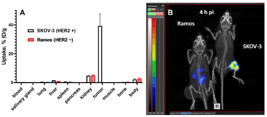 The HER2-specificity of 188Re-ZHER2:41071 accumulation in tumor xenografts was evaluated by comparison of the uptake in HER2-positive SKOV-3 and HER2-negative Ramos xenografts in BALB/C nu/nu mice 4 h after injection. (A) Biodistribution. Results of ex vivo measurements are presented as % ID/g ± SD (n = 4). (B) Imaging of 188Re-ZHER2:41071 in BALB/C nu/nu mice bearing SKOV-3 and Ramos xenografts 4 h after injection. The scale is linear showing arbitrary units normalized to a maximum count rate.