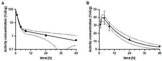 Time-activity concentration curves for (A) kidneys and (B) SKOV-3 tumor. The biodistribution data were fitted with bi-exponential curves; in the kidneys 90%/g with T1/2 = 44 min and 3%/g with T1/2 = 17 h and in the tumor uptake proceeded with T1/2 = 35 min to a maximum of 49%/g and clearance with T1/2 = 12 h. The fitted curves and its 95% confidence intervals are indicated.
