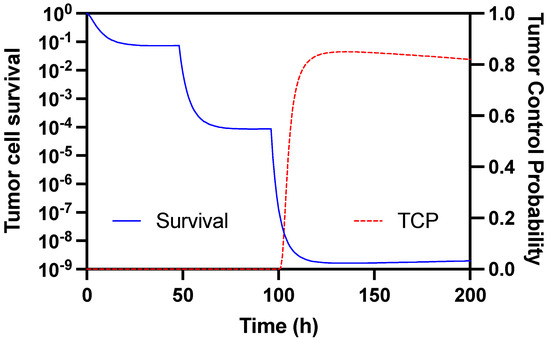 The initial clonogenic cell density was set at 109 cells/g, leading to N0 = 1.0 × 108 clonogenic cells in a 100 mg tumor. The cell survival and TCP was evaluated for various dosing schemes at multiple therapy cycles and intervals between.