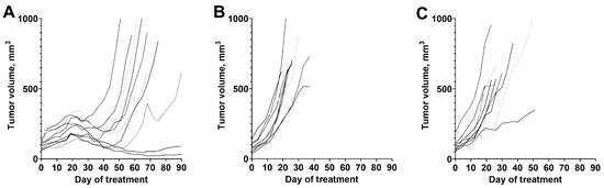 The growth of individual tumors in mice treated with (A) 188Re-ZHER2:41071 (three times with 5 µg, 16 MBq, dissolved in 10% ethanol in 0.9% saline), (B) non-labeled ZHER2:41071 (three times with 5 µg, dissolved in 10% ethanol in 0.9% saline), and (C) vehicle (three times with 10% ethanol in 0.9% saline).
