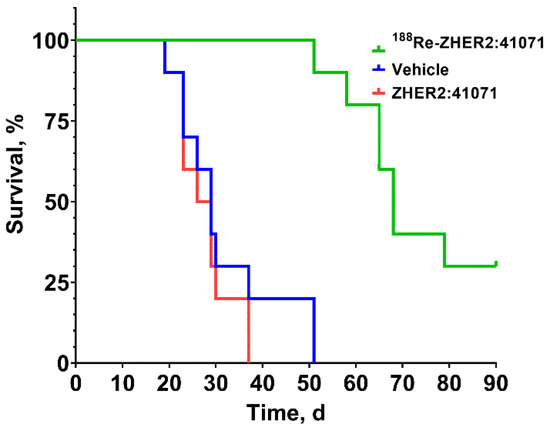The survival of mice treated with 188Re-ZHER2:41071 (three times with 5 µg, 16 MBq, dissolved in 10% ethanol in 0.9% saline), non-labeled ZHER2:41071 (three times with 5 µg, dissolved in 10% ethanol in 0.9% saline), and vehicle (three times with 10% ethanol in 0.9% saline).