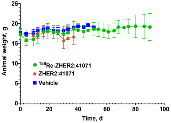 The average body weight of mice after treatment with188Re-ZHER2:41071 (three times with 5 µg, 16 MBq, dissolved in 10% ethanol in 0.9% saline), non-labeled ZHER2:41071 (three times with 5 µg, dissolved in 10% ethanol in 0.9% saline), and vehicle (three times with 10% ethanol in 0.9% saline).