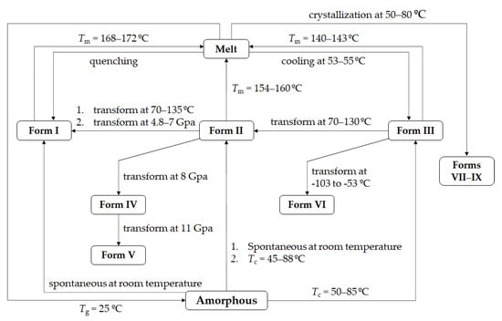 To date, nine anhydrous polymorphs of PCA had been discovered and named Forms I to IX. Their phase transitions are illustrated in Figure 1. Forms I, II, and III PCA were accessible by solution crystallization under ambient temperature and pressure [,,]. Forms IV and V were produced by compressing PCA at high pressure (Figure 1) []. Form VI was formed from Form III by cooling to between 170 and 220 K []. Forms VII, VIII, and IX were obtained by melt crystallization on a hot stage at 50 to 80 °C []. Except for Forms I, II, and III PCA, the other polymorphs were found in recent years, and thus their crystallographic data, stability, and physicochemical properties are lacking. In addition, three hydrate forms of mono- [], di- [], and tri-hydrate [] and seven solvates of PCA were reported as well [,,].