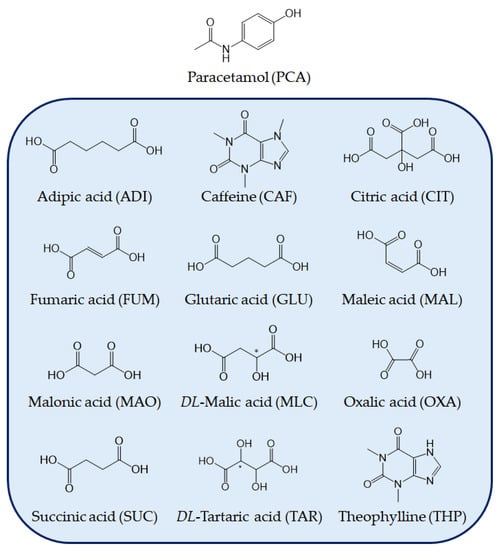 Adipic acid (ADI) (Lot MKBF9110V from USA), caffeine (CAF) (Lot 099k1441 from China), citric acid (CIT) (Lot 057K0090 from USA), DL-malic acid (MLC) (Lot MKBS7851V from China), sodium acetate (NaAc) (Lot SLBT2099 from Japan), succinic acid (SUC) (Lot 058K0706 from Switzerland), and theophylline (THP) (Lot MKCJ8498 from China) were purchased from Sigma-Aldrich. Fumaric acid (FUM) (Lot 10202035 from Canada), glutaric acid (GLU) (Lot 10186568 from UK), malonic acid (MAO) (Lot 10146415), and DL-tartaric acid (TAR) (Lot 10103590) were received from Alfa Aesar. Maleic acid (MAL) (Lot A0414668 from Spain) was obtained from Acros Organics. Sodium phosphate monobasic monohydrate (Lot E07165 from USA) was purchased from J.T. Baker. PCA (Lot 0540385 from China) was received from Anqiu Lu’an Pharmaceutical Co., Ltd. Phosphoric acid (aq) (86% assay, Lot. Ts10510B from Taiwan) was obtained from Echo Chemical Co., Ltd. Oxalic acid (OXA) dihydrate (Lot H4P111 from South Korea) was purchased from Daksun Pure Chemicals Co., Ltd. All chemicals have a purity of ≥99% and were used as received without further purification. Reverse osmosis (RO) water was treated through a water purification system (model Milli-RO plus) from Millipore (Billerica, MA, USA).