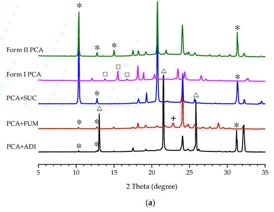 In the cases of ADI and FUM, Form II PCA began to form at weight percentages of ≥50 and ≥20 wt%, respectively, as shown in Table 2. However, it was accompanied by ADI or FUM crystals due to their lower solubilities. When the weight percentage of ADI was increased to 75 and 100 wt%, Form I PCA was generated along with the mixture of Form II PCA and ADI crystals. We hypothesized that the precipitation of ADI led to a decline in the concentration of ADI and sequentially induced the nucleation of Form I PCA or polymorphic transformation from Form II to Form I.