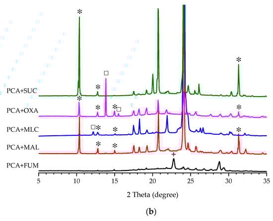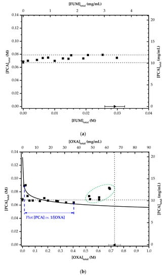 Figure 8 displays the solubility diagrams of PCA in the presence of FUM and OXA. As shown in Figure 8a, the solubility of PCA could be enhanced by a narrow margin of 10% as the concentration of FUM was increased. The linear correlation at the whole [FUM] region indicated no formation of a PCA–FUM co-crystal.