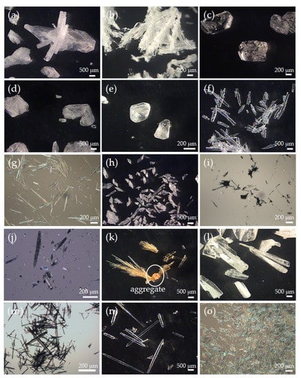 OM images of the PCA crystals produced by Screening Method 1 with (a) ADI, (b) FUM, (c) MAL, (d) MLC, (e) OXA, (f) SUC, and (g) THP, and by Screening Method 2 with (h) ADI, (i) CAF, (j) FUM, (k) MAL, (l) MLC, (m) OXA, (n) SUC, and (o) THP. The impurity in (k) is indicated by a circle.