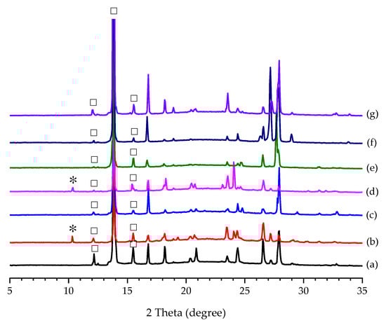 PXRD patterns of the PCA crystals harvested by seeding the PCA aqueous solutions with (a) Form I PCA, (b) Form II PCA, (c) ADI, (d) FUM, (e) MLC, (f) OXA, and (g) SUC. The characteristic peaks of Form I PCA and Form II PCA are labeled by ☐ and ✴, respectively.