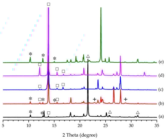 PXRD patterns of the PCA crystals harvested by seeding the PCA–additive aqueous solutions with (a) ADI, (b) FUM, (c) MLC, (d) OXA, and (e) SUC. The characteristic peaks of Form I PCA, Form II PCA, ADI, and FUM are labeled by ☐, ✴, △, and +, respectively.
