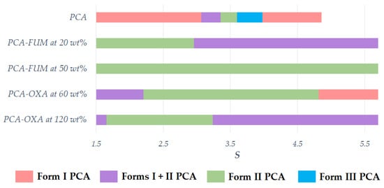 With the assistance of OXA at 60 wt%, the nucleation of PCA gave a similar trend as that in the absence of additive [,]. PCA was crystallized as from Form I to a mixture of Forms I + II and then to pure Form II PCA when S increased in the absence of additive (Figure 7). According to Figure 7, when S was located in the range between 2.2 and 4.8, the stability for yielding Form II PCA was increased. Nevertheless, Form I PCA tended to form as S was further increased above 4.8. As for the case of adding 120 wt% of OXA (i.e., PCA:OXA = 1:2 mol/mol), the S ranges for Form I and the mixture of Forms I and II PCA were wider than the ones for 60 wt% of OXA (i.e., PCA:OXA = 1:1 mol/mol). Therefore, the effect of S was dependent on the type and the amount of additives contained in the solution.